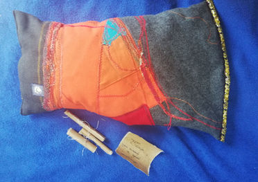 Unikatno zašita prevleka iz koščkov blaga in niti, v njej pa skrita blazinica, napoljnjena s pirinimi ali ajdovimi luščinami in sivko. Ko se razdiši, jo lahko ponovno napolnimo. Ob strani je zadrga, da je prevleka tudi pralna.